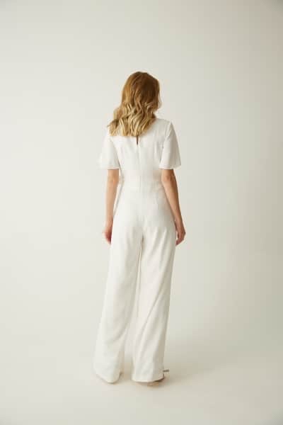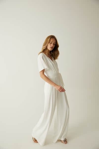 Der Jumpsuit aus Crepe hat eine lange weite Hose und fühlt sich angenehm auf der Haut an. Das Band an der Taille schmeichelt deiner Figur und rundet den Look mit einem süßen Detail, einer Schleife, ab.