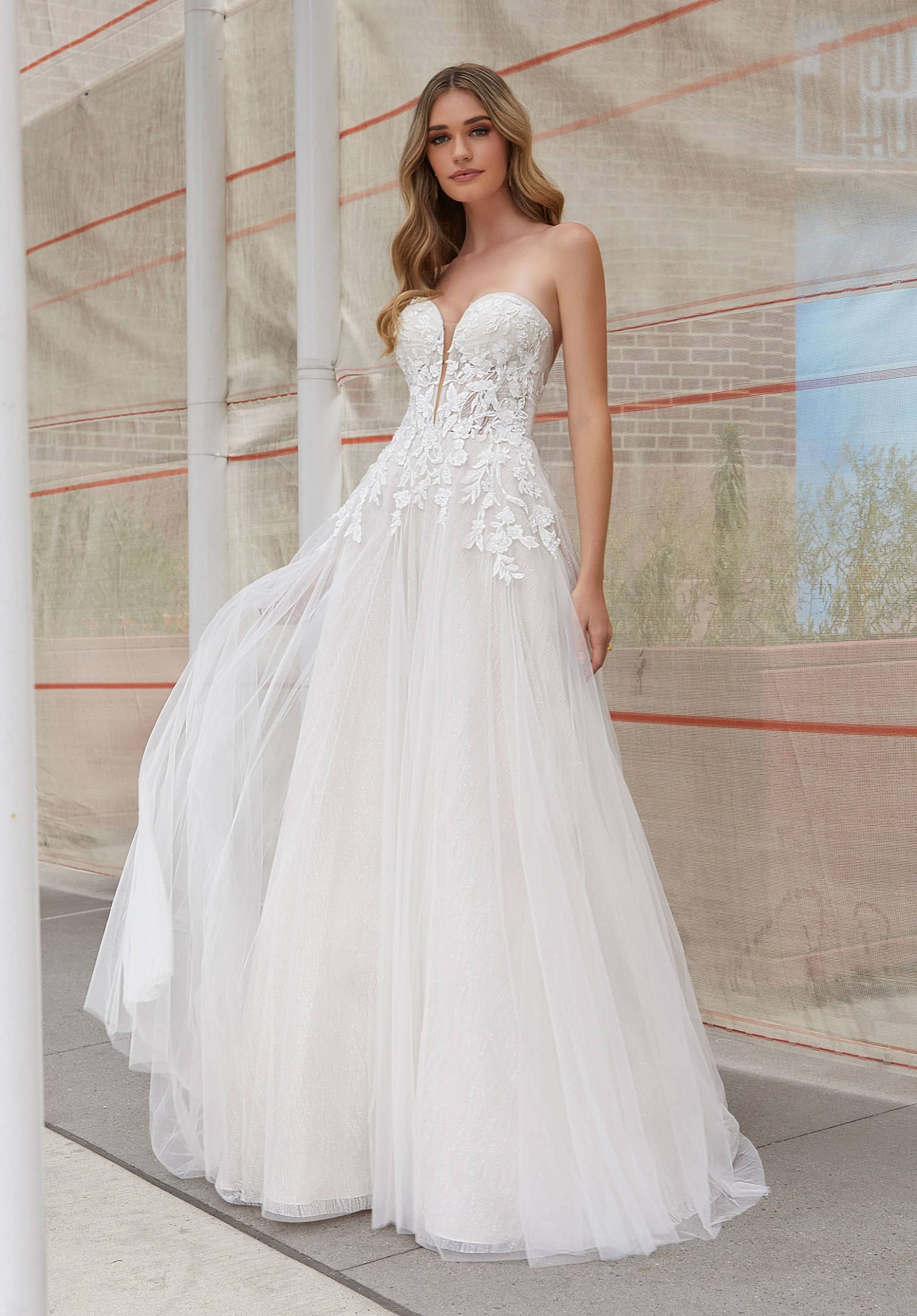 Klassisch und romantisch – Die mühelose A-Linien-Silhouette verfügt über eine tiefe Taille, die den Körper streckt und durch den tiefen herzförmigen Ausschnitt betont wird. Dekadent, mit Kristallperlen besetzte, dreieckig Blumenstickerei fühlt sich auf dem gemusterten Glitzertüll frisch und feminin an. Zarte, abnehmbare, applizierte Träger verleihen diesem zeitlosen Kleid eine dekorative Note