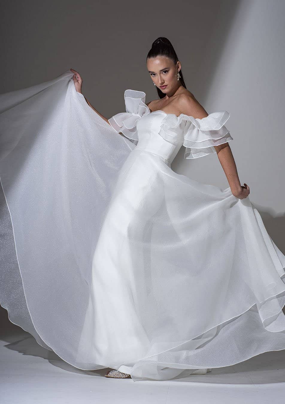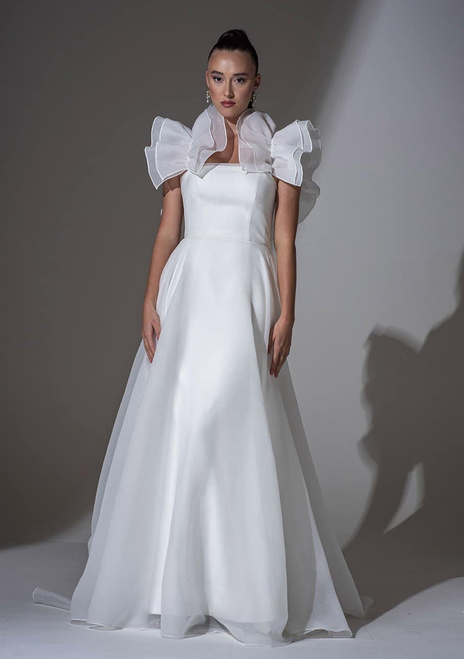 Kleid aus gecrashtem Organza mit separaten Ärmeln, figurbetontes Oberteil mit einem A-Linien-Rock (unser Modell im Store weicht leicht von den Produktbildern ab in Bezug auf den Rock sowie die Ärmel)