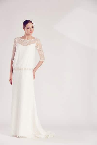 Ein Jackenkleid mit einer kleinen Schleppe. Eine gut sitzende, langgezogene, minimalistische Jacke, die mit einem Rock verlängert wurde. Die elfenbeinfarbene Jacke und der Rock sind aus einem dehnbaren Futter und Krepp gefertigt. Es wird mit elfenbeinfarbenen Atlasknöpfen auf der Vorderseite des Jacken-Kleides geschlossen.