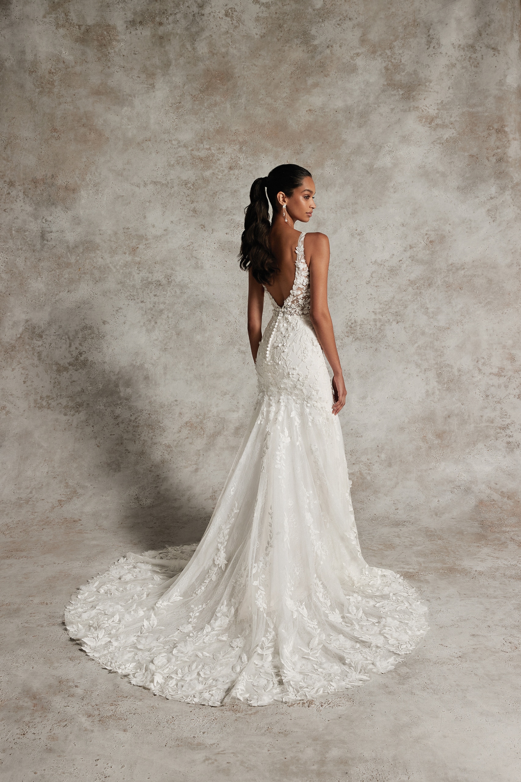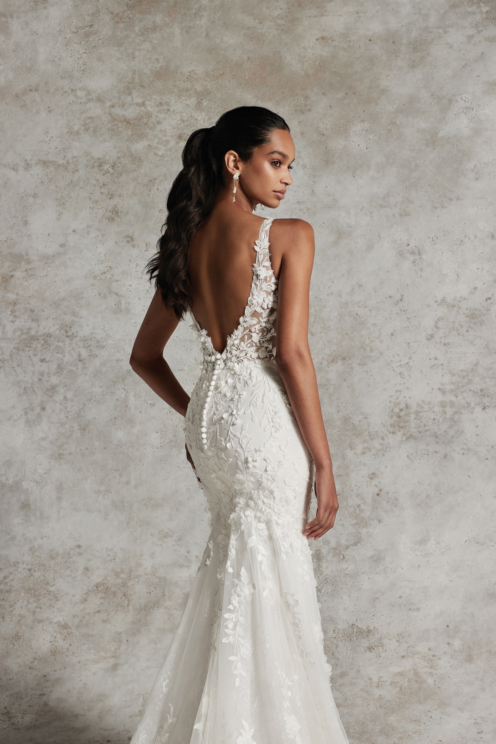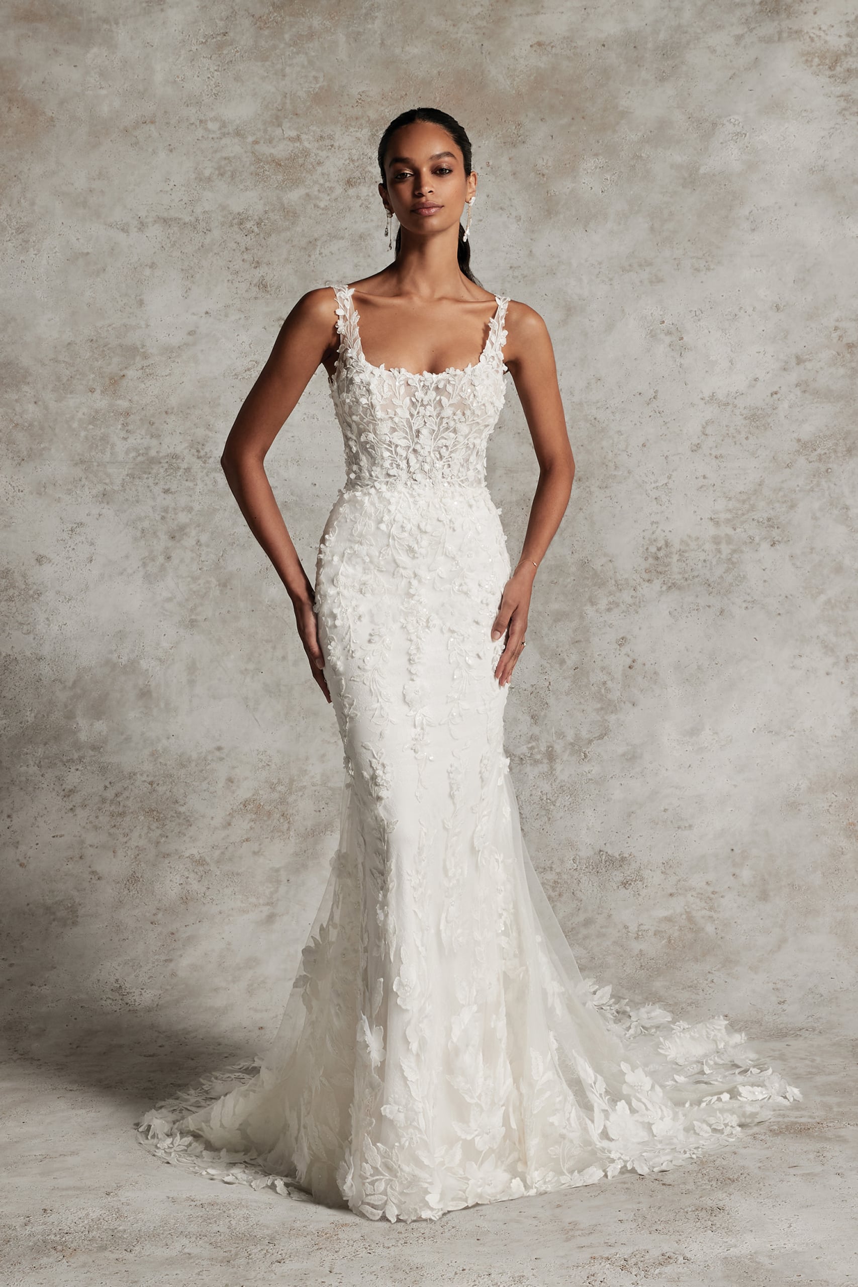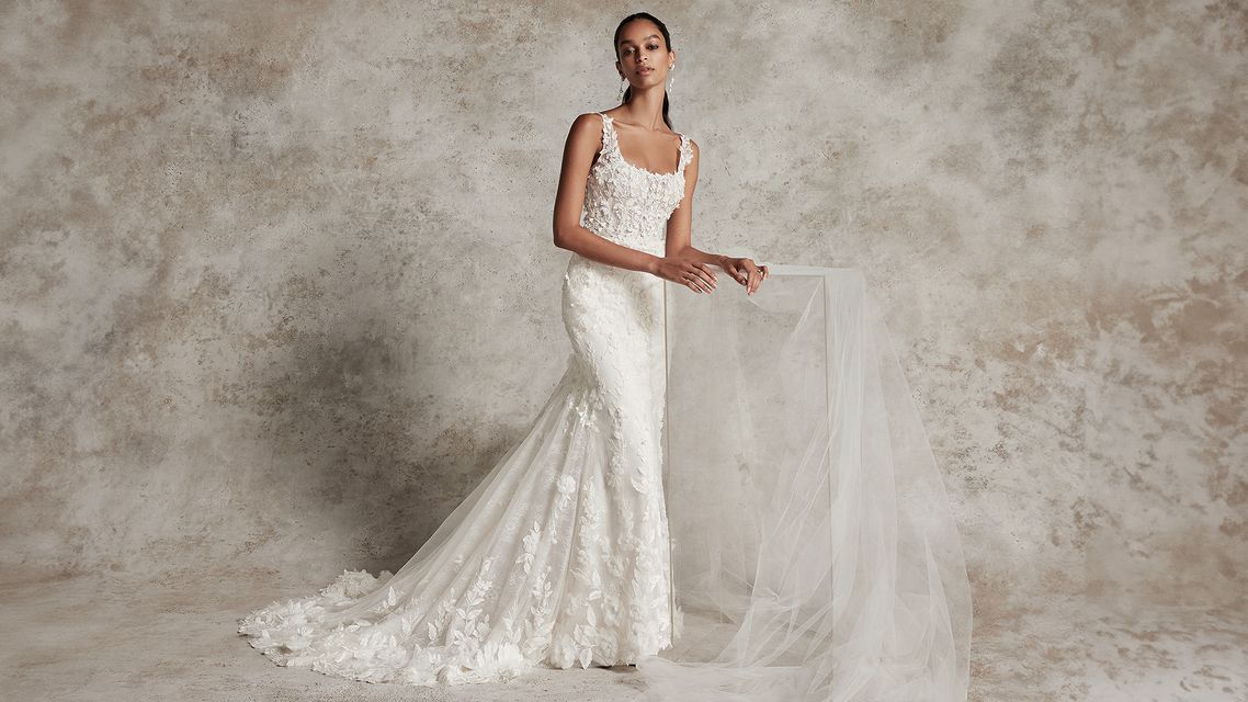 Hochzeitskleid mit quadratischem Ausschnitt und 3D-Applikationen im Fit&Flare-Design