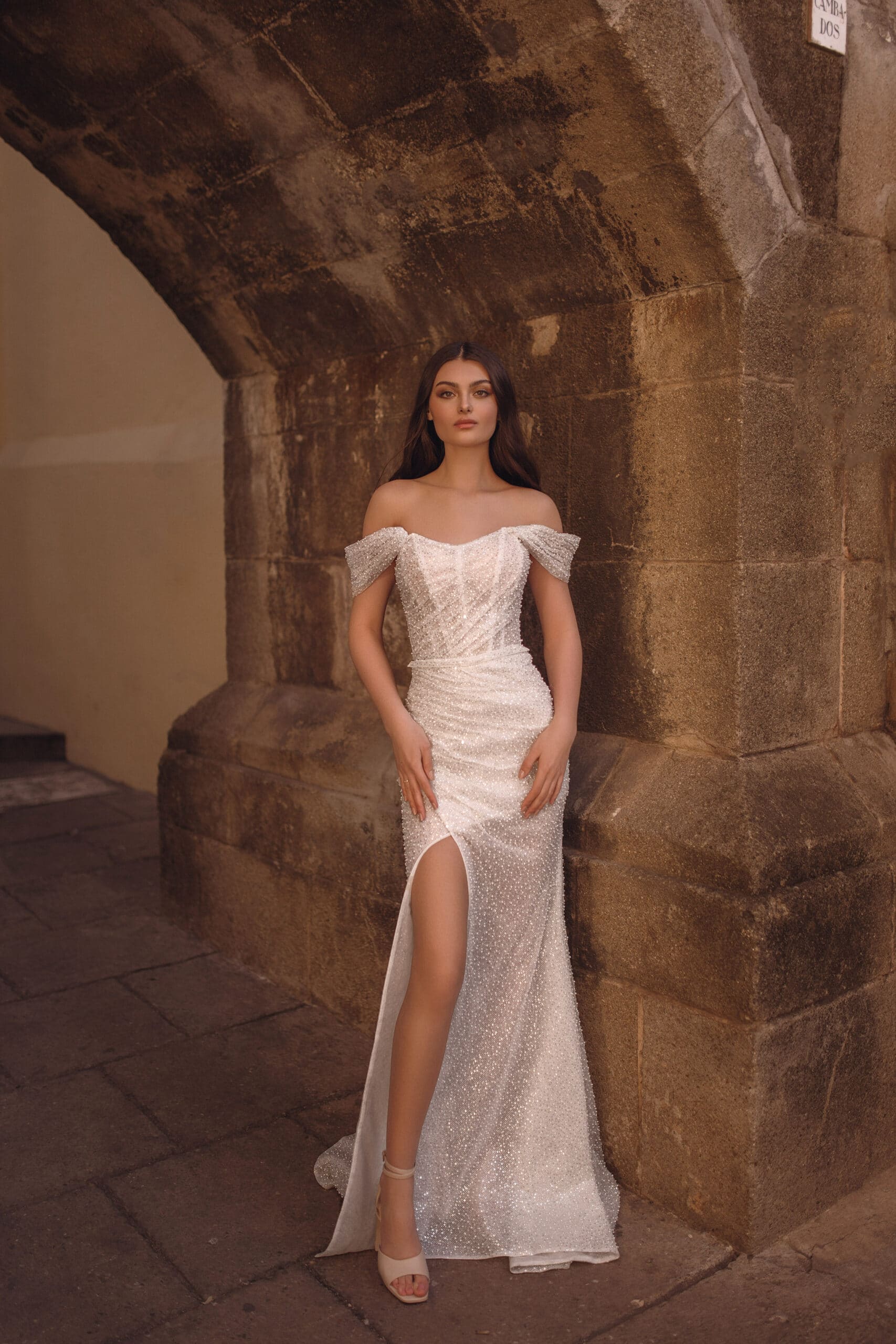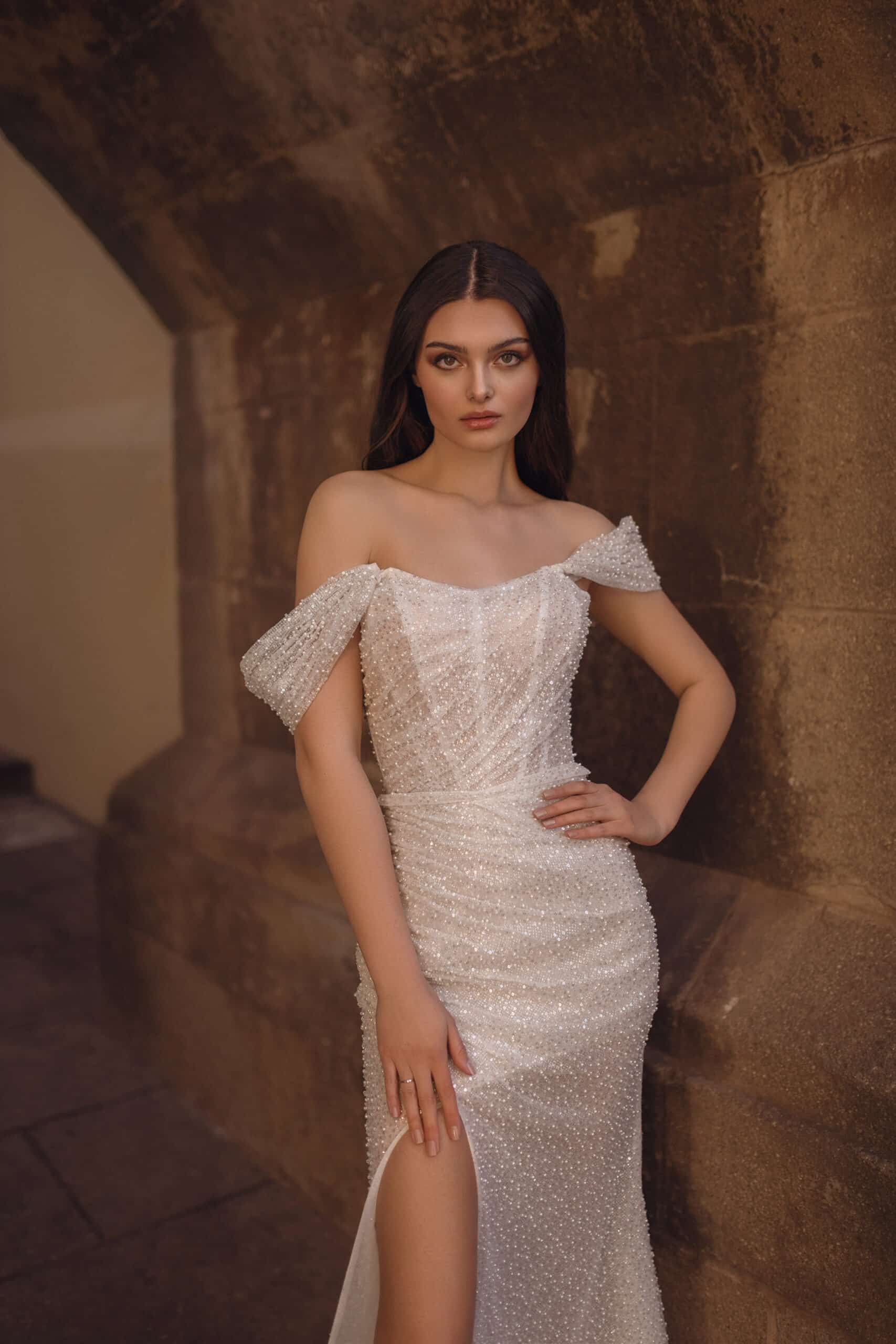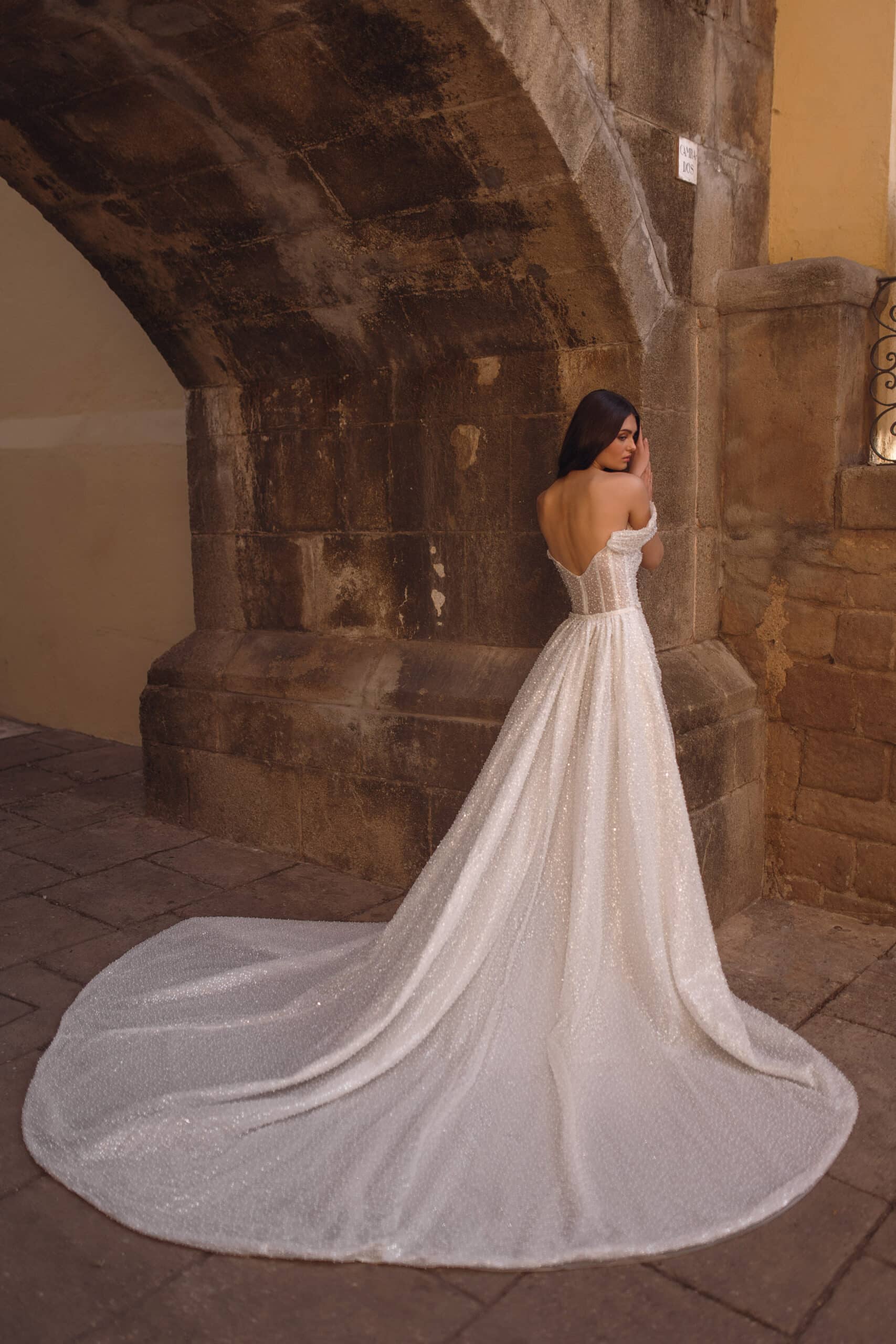 Eine Kombination aus Glitzer, Tüll und Perlen, während die Meerjungfrau-Silhouette des Kleides der Figur wunderbar schmeichelt. Die abnehmbare Schleppe ist im Store nicht erhältlich, kann aber auf Wunsch (verbindlich) bestellt werden.