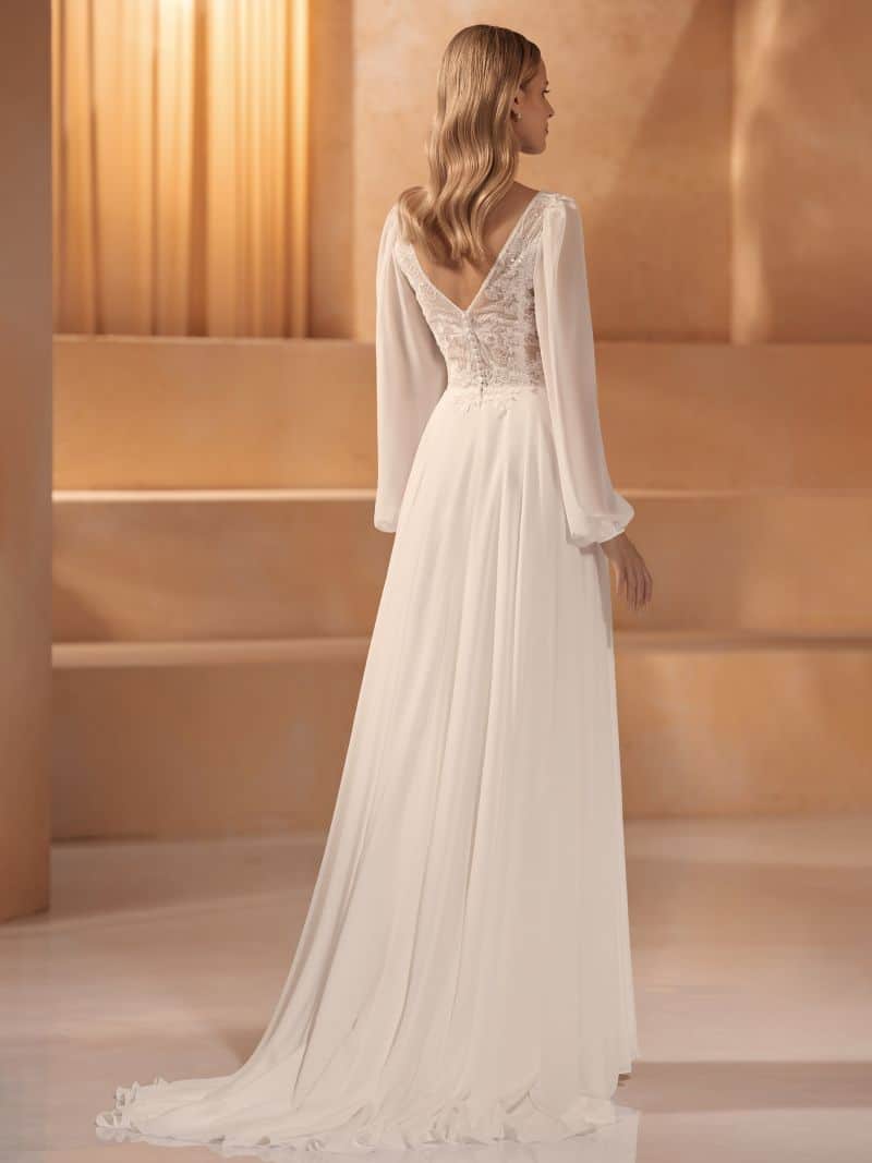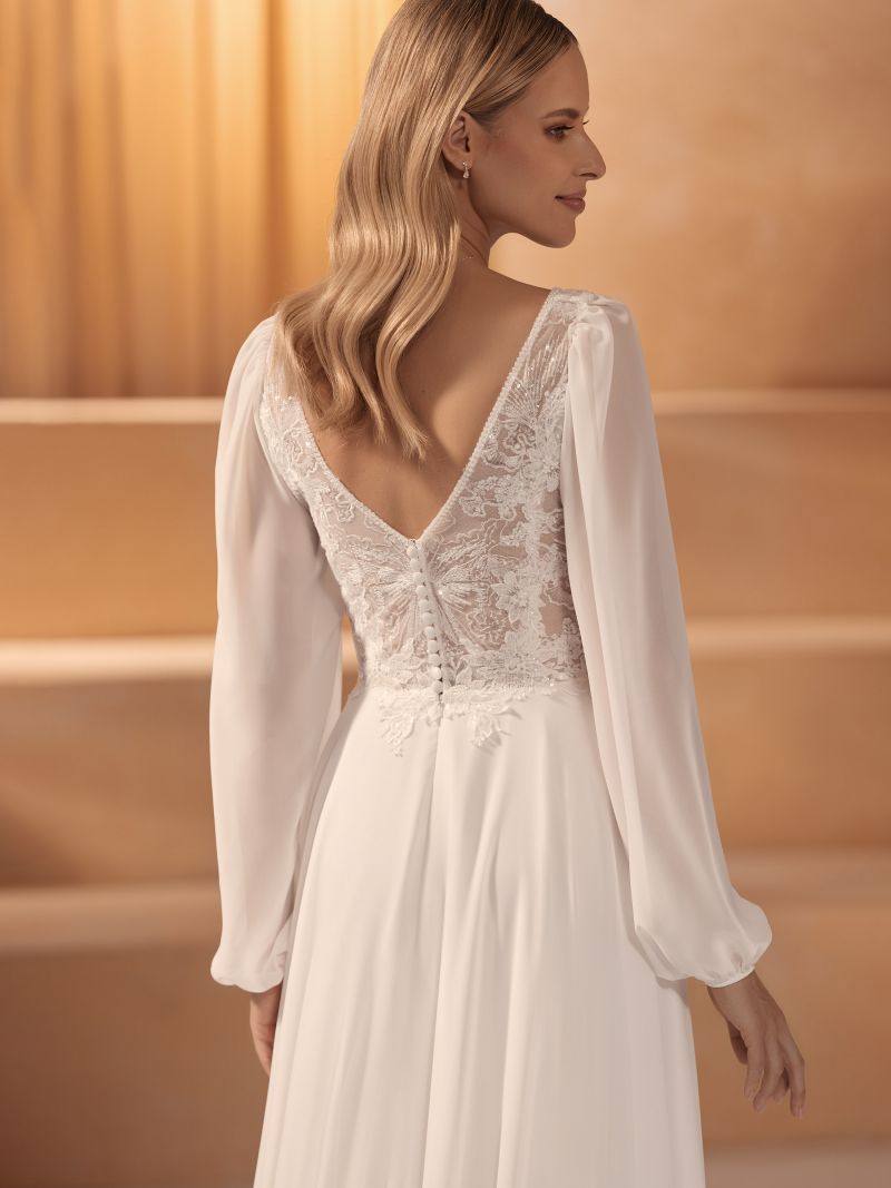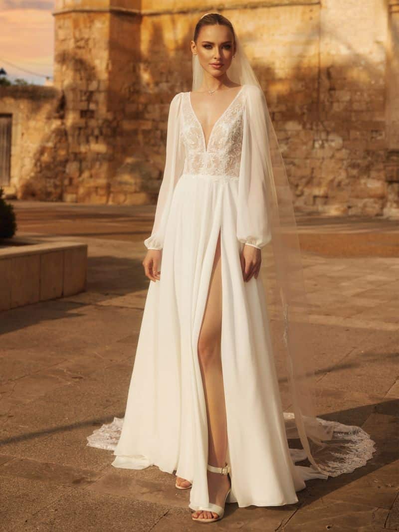Ein modernes Kleid in A-Linie RAMONA ist perfekt für Bräute, die lange Ärmel bevorzugen. Dieses Kleid hat sowohl vorne als auch hinten einen V-Ausschnitt und ist mit floraler Spitze bestickt.