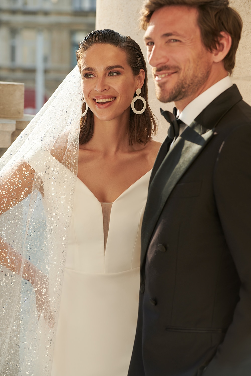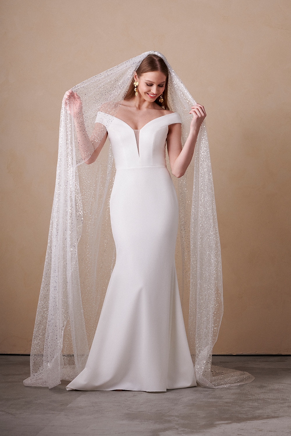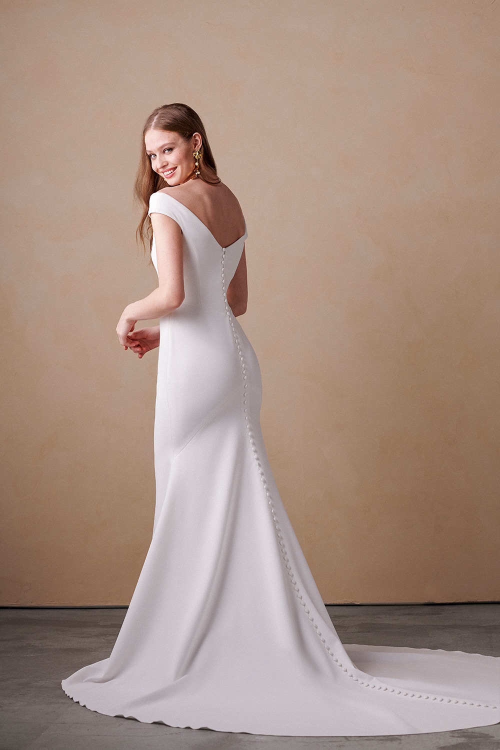 Ein fantastisches Crepe-Kleid im Meerjungfrauen-Stil mit tiefem Ausschnitt! Das Oberteil hat transparenten Tüll in der Mitte und einen leicht schulterfreien Ausschnitt. Die Rückseite ist offen. Das Kleid hat eine Schleppe und eine Knopfleiste am Rücken und an der Schleppe.