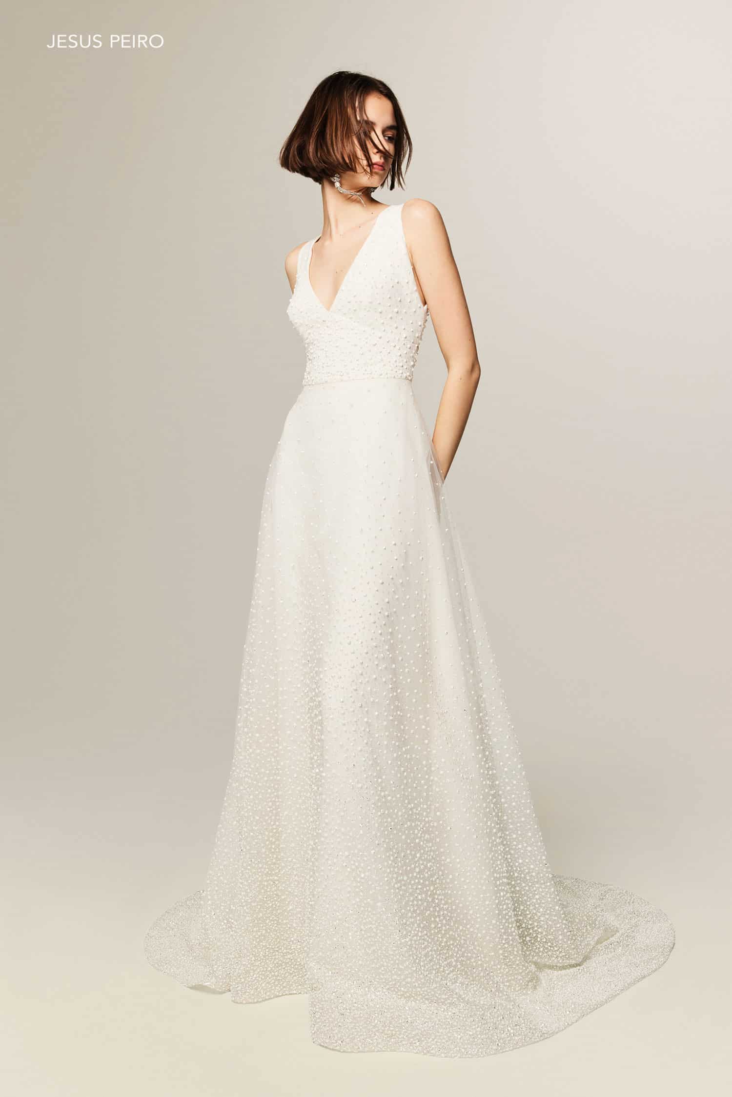 Kleid in A-Linie aus Tüll mit Reliefdruck mit Punktemuster und durchscheinender Stickerei. Rücken mit eckigen Durchbrechungen