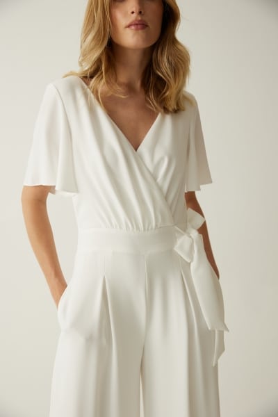 Der Jumpsuit aus Crepe hat eine lange weite Hose und fühlt sich angenehm auf der Haut an. Das Band an der Taille schmeichelt deiner Figur und rundet den Look mit einem süßen Detail, einer Schleife, ab.