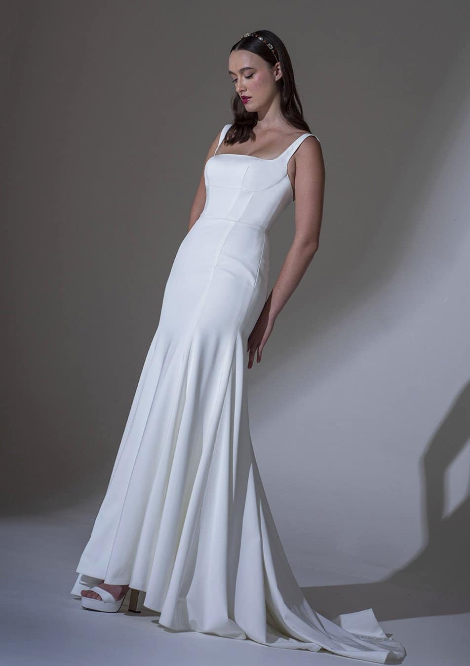 Modernes Kleid aus Krepp mit gesäumtem Mieder und quadratischem Ausschnitt sowie einem hüftumspielenden ausgestellten Rock.