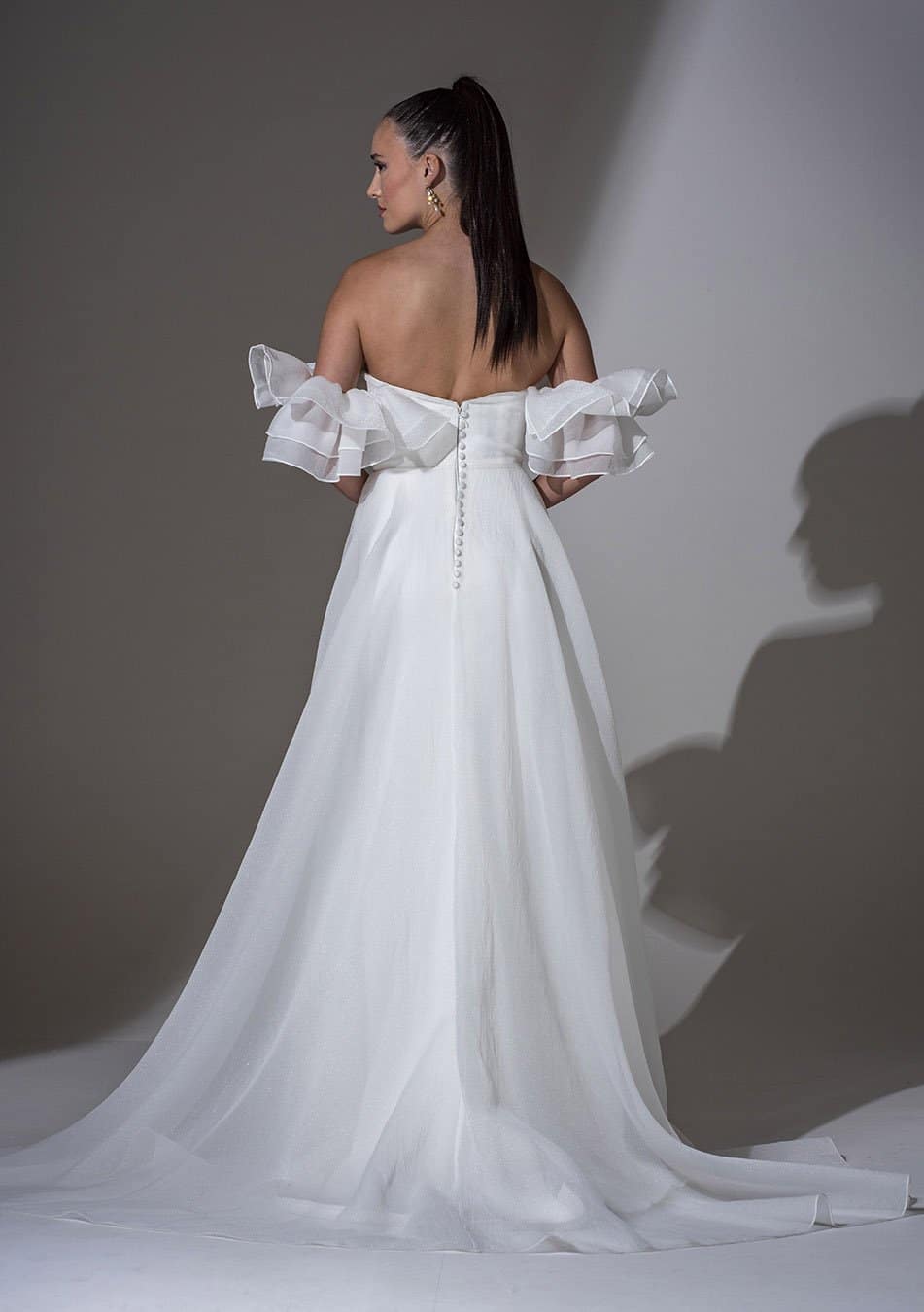 Kleid aus gecrashtem Organza mit separaten Ärmeln, figurbetontes Oberteil mit einem A-Linien-Rock (unser Modell im Store weicht leicht von den Produktbildern ab in Bezug auf den Rock sowie die Ärmel)