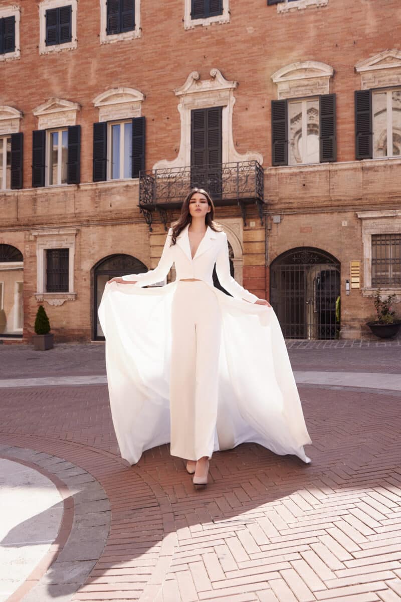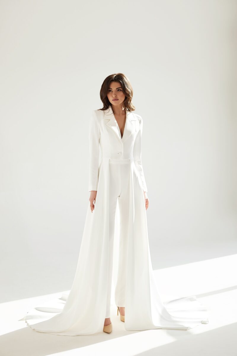 Ein Jackenkleid mit einer kleinen Schleppe. Eine gut sitzende, langgezogene, minimalistische Jacke, die mit einem Rock verlängert wurde. Die elfenbeinfarbene Jacke und der Rock sind aus einem dehnbaren Futter und Krepp gefertigt. Es wird mit elfenbeinfarbenen Atlasknöpfen auf der Vorderseite des Jacken-Kleides geschlossen.