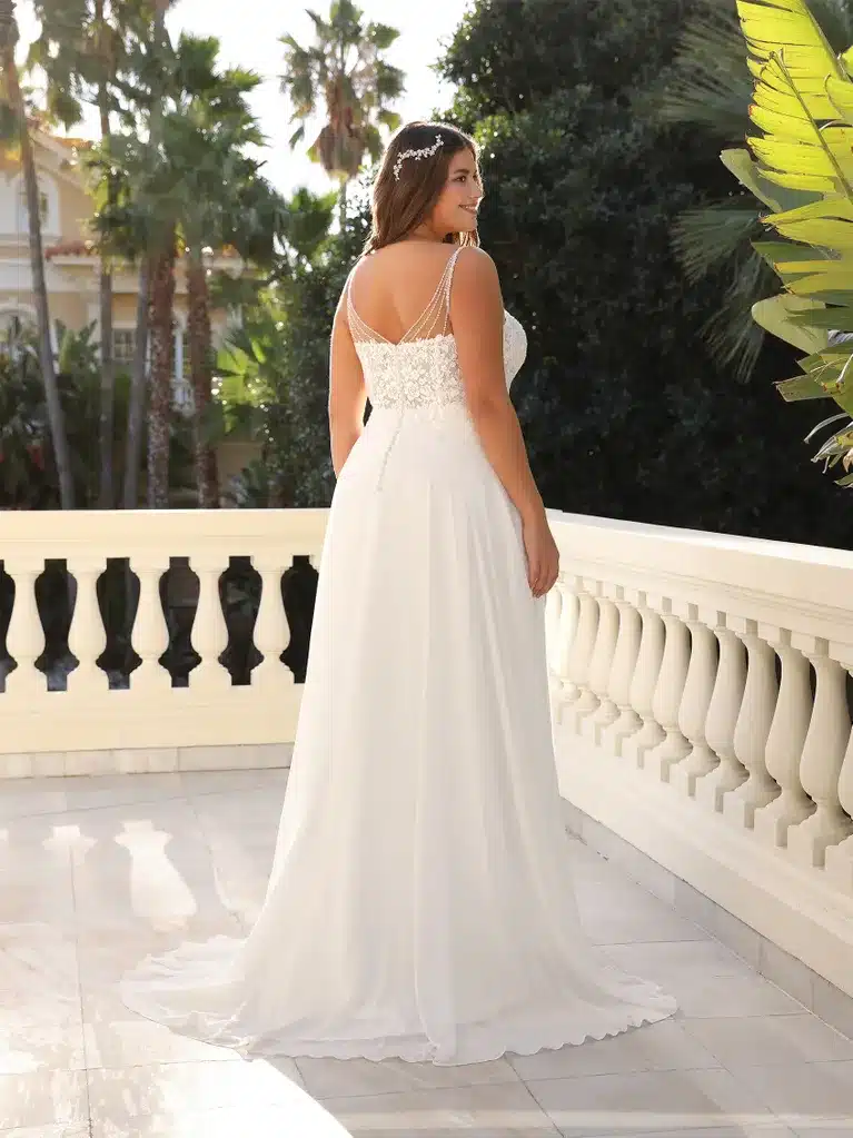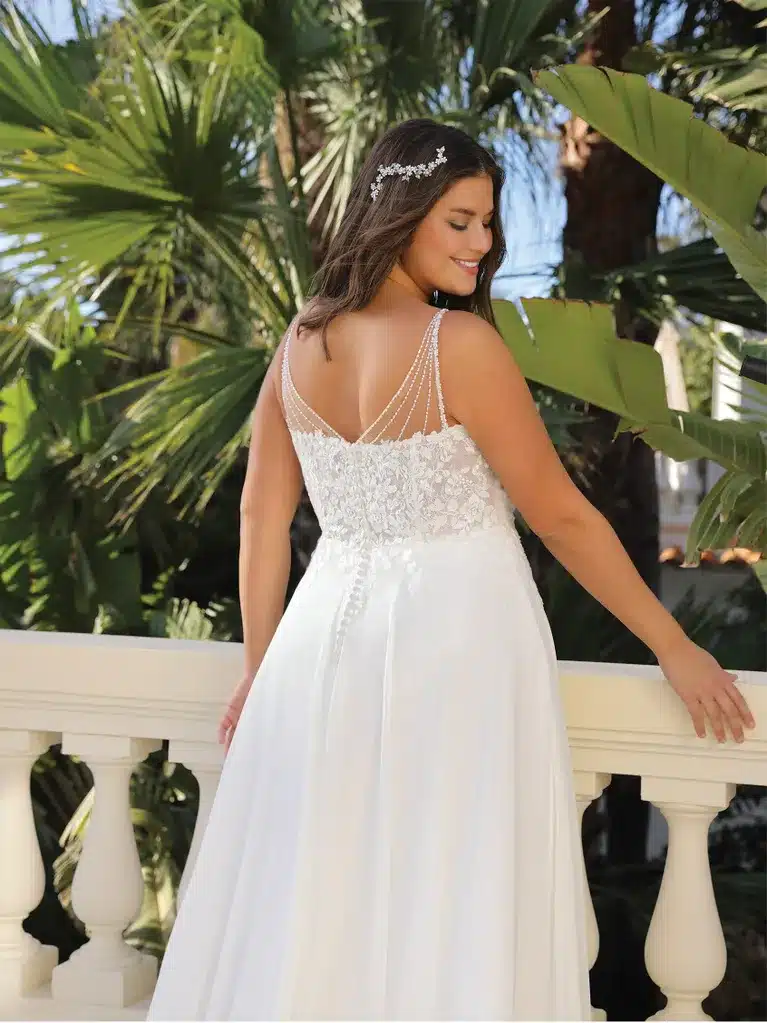 Fließendes Brautkleid in A-Schnitt mit V-Rücken und V-Ausschnitt